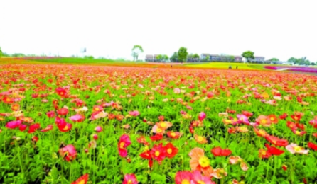 ■ 七彩花瀑 由数十万株不同花色的虞美人、波斯菊、硫华菊等组成。从高处远远望去,犹如陆地上涌现出的一条条鲜花瀑布,随风而动,煞是好看,引来不少画家、艺术院校师生、摄影爱好者到此进行创作。